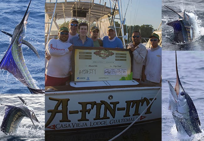 The seas were flat calm and plentiful. Shortly after leaving the dock, at about 19 miles out, they had their first bite. By noon they had already released 30 sailfish! Around 1:30pm they ran out of bait because of the nonstop action and Captain Dave Salazar came to the rescue with 4 dozen more ballyhoo.
