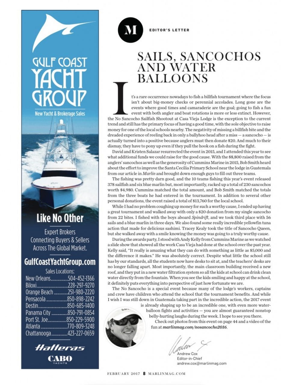 Feb152017Fishing TournamentsLodge NewsPress & Media CoverageThe 2017 February Issue of Marlin Magazine Editor’s note by Andrew Cox. Read the Article (PDF) Categories: Fishing Tournaments, Lodge News, Press & Media CoverageFebruary 15, 2017 Share this post Share on FacebookShare on Facebook Share on XShare on X Share on LinkedInShare on LinkedIn Post navigationPreviousPrevious post:Billfish Market Spikes to Record High in 2017NextNext post:A Grand Ol’ TimeRelated postsRecord Breaking NewsMarch 26, 2026Love at First StrikeFebruary 26, 202639044 Raises, 33761 Bites, 22128 Sailfish Released in 2025January 29, 2026Beginning To Look a Lot Like FishmasDecember 22, 2025