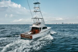 Even though this boat is technically 42 feet, the Merritt company marketed this line of boats as the 43′ series. The 43′ series was a type of hull that started a little bit before Roy’s ownership, in 1968, and continued on successfully through 1982. This era of boats was inspired the 42-foot Hopalong—the 13th, and longest, hull Buddy Merritt had designed at that time—built for Fletch Creamer and Capt. Buddy Lander in 1965. What set these class of vessels apart from the rest was the transition from framed to cold molded construction.